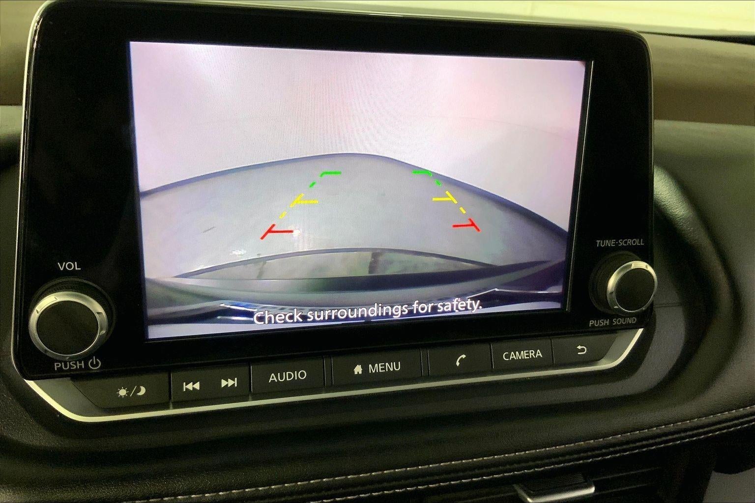 - The vehicle is equipped with a camera that displays an image of the area behind the vehicle on an interior display.