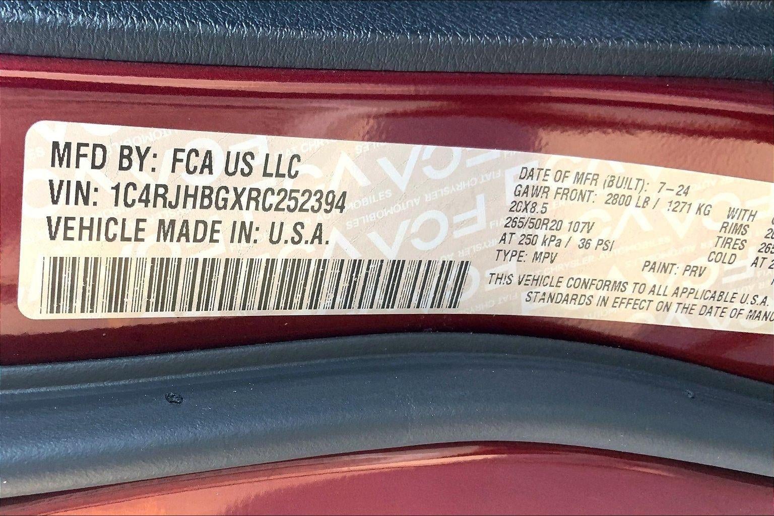 ENGINE: 3.6L V6 24V VVT UPG I W/ESS, TRANSMISSION: 8-SPEED AUTOMATIC (850RE), QUICK ORDER PACKAGE 22E, WHEELS: 20"" X 8.5"" GLOSS BLACK PAINTED ALUMINUM, TIRES: 265/50R20 A/S PERFORMANCE, VELVET RED PEARLCOAT, GLOBAL BLACK, CAPRI LEATHERETTE SEATS, BLACK APPEARANCE PACKAGE, DUAL-PANE PANORAMIC SUNROOF, FRONT LICENSE PLATE BRACKET