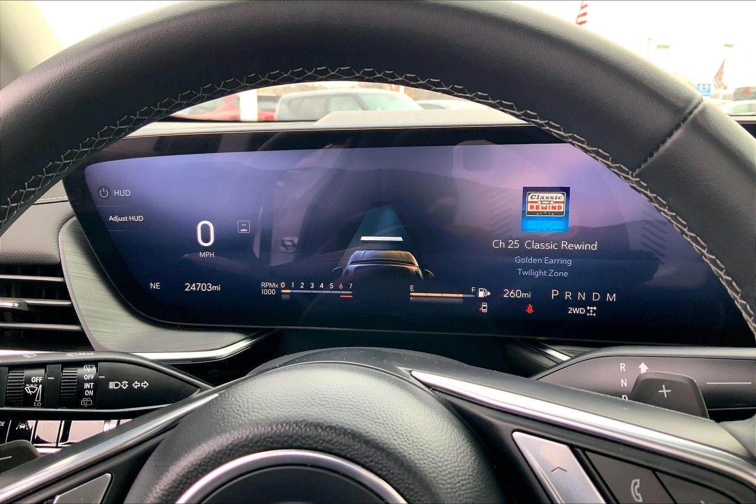 - The vehicle is equipped with a camera that displays an image of the area behind the vehicle on an interior display.